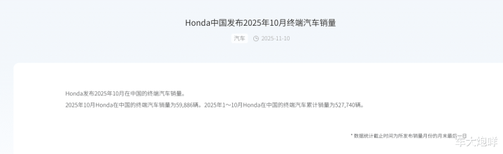 11月10日,本田中国公布了最新的销售业绩。据官方数据显示,2025年10月本田在中国的终端汽车销量为59886辆,同比下滑20%;1-10月累计终端汽车销量527740辆,较上年同期下滑20.5%。作为对比广盛网 ,2024年10月本田在中国的终端汽车销量75440辆,2024年1-10月终端汽车累计销量663626辆。