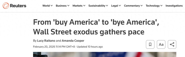 [环球网财经综合报道]据路透社消息,随着大型科技股的回报逐渐消退,以及表现更好的海外市场变得更具吸引力,美国投资者正以至少16年来的最快速度撤离本国股市。